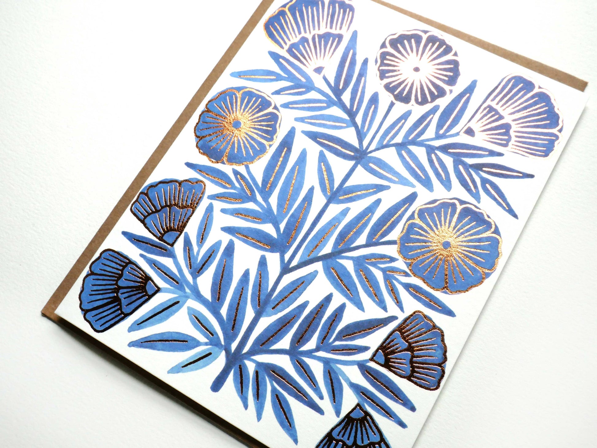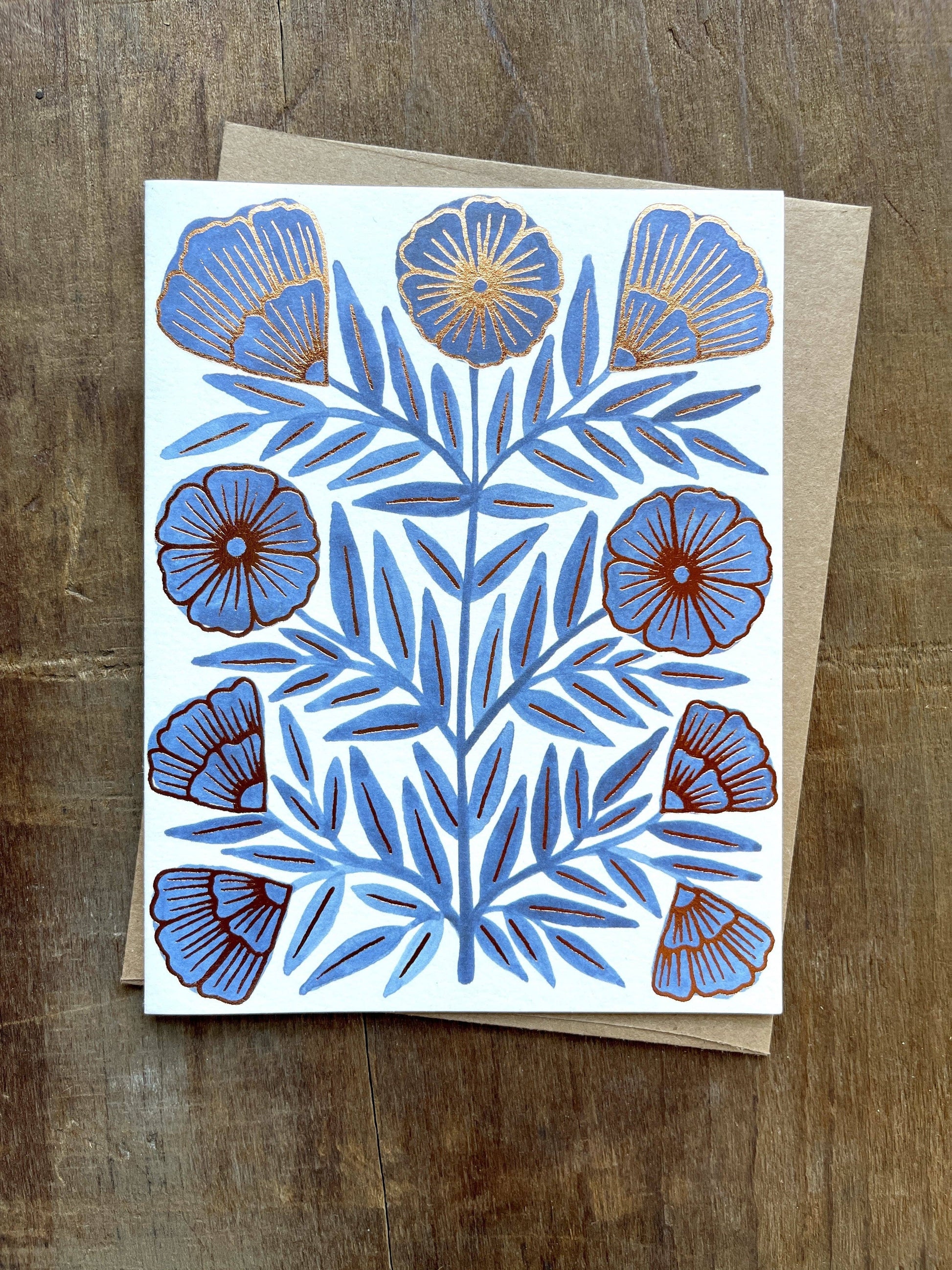 A Katharine Watson foil-stamped card, featuring real copper foil. Each card is a standard A2 size, 5 ½” by 4 ¼”, is blank on the inside, and comes with a 100% recycled kraft envelope.