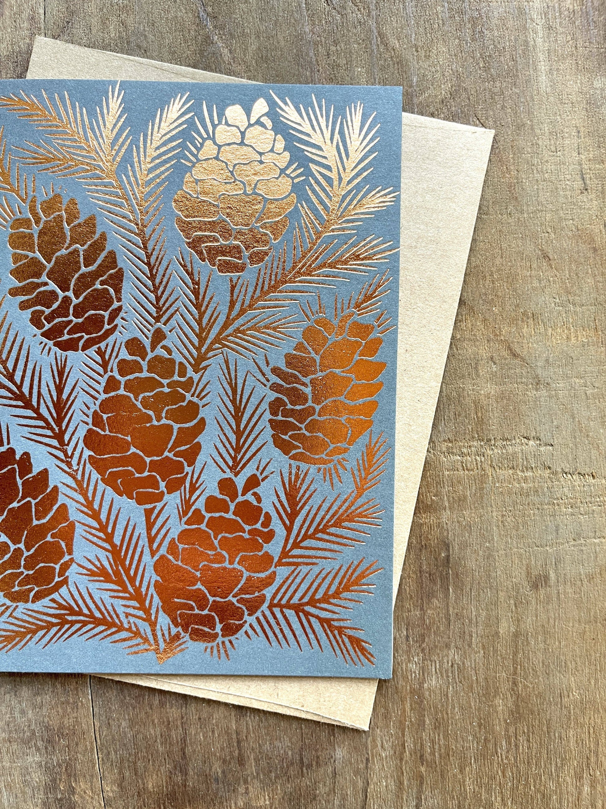 A Katharine Watson foil-stamped card, featuring real copper foil. The card is a standard A2 size, 5 ½” by 4 ¼”, and is blank on the inside, and each card comes with a 100% recycled kraft envelope. For her foil-stamped cards, Katharine begins each design with a watercolor painting or hand-carved linoleum block, which is turned into a greeting card design and individually foil-stamped.