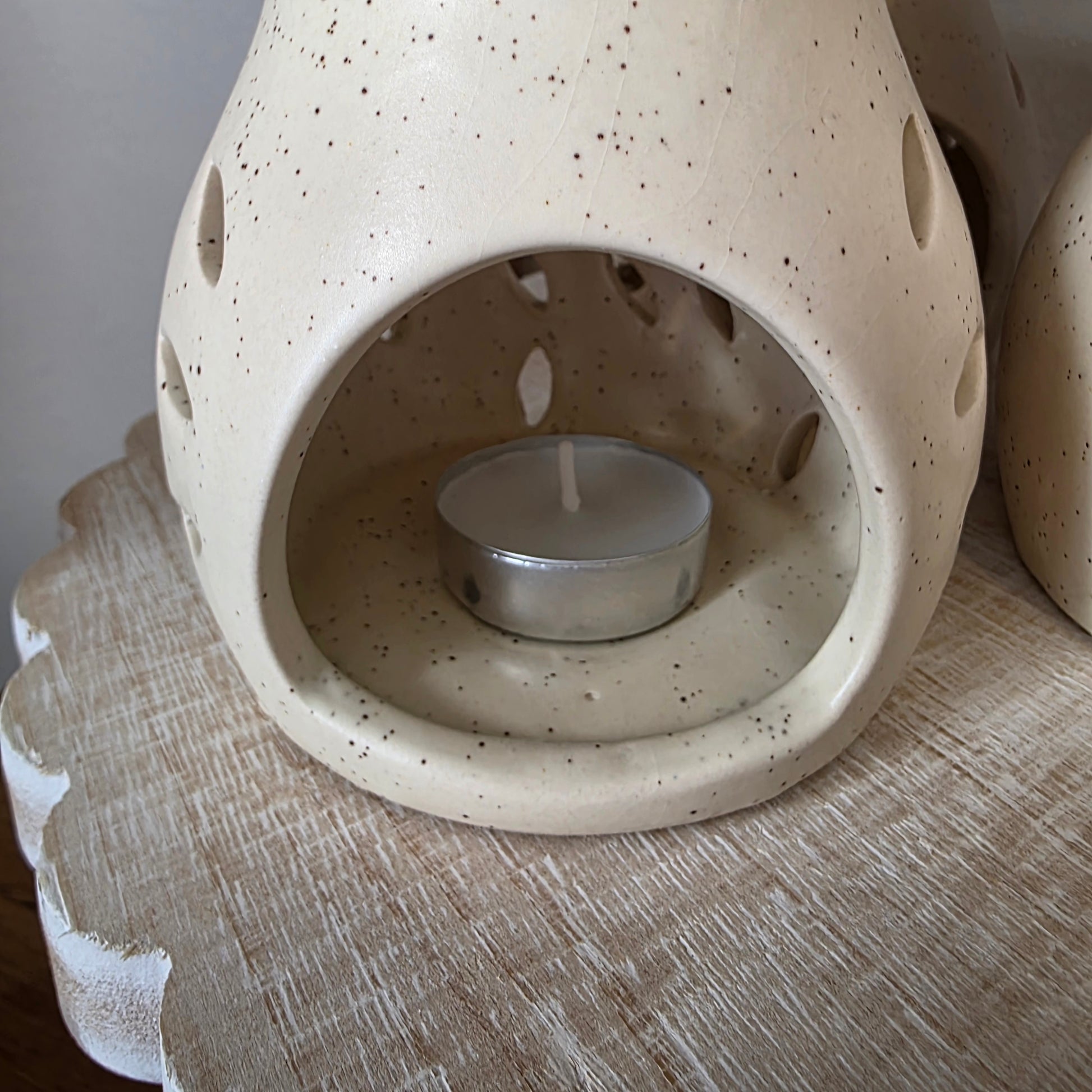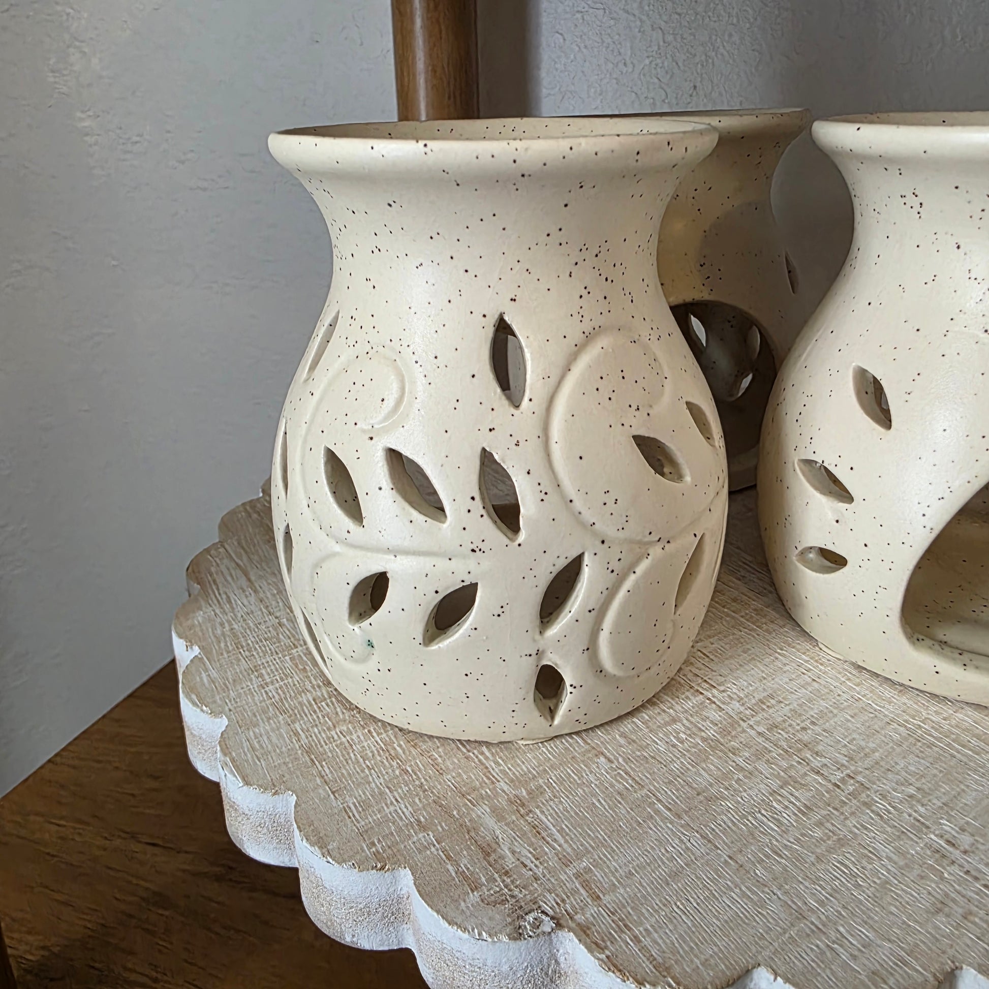 Bring warmth and charm to your home with this cream-colored ceramic wax melt warmer, finished in a soft satin glaze with subtle speckled accents. Its timeless, minimalist design blends beautifully into any décor, from cozy cottage to modern farmhouse.