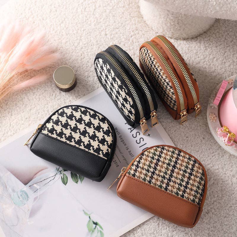 Compact and Convenient: This charming coin purse features two zippered pouches for your change, makeup, ID cards, and more. Crafted from high-quality fabric, it boasts a timeless houndstooth pattern, offering a blend of classic style and modern fashion. Its elegant design and compact size make it a perfect accessory for everyday use, easily fitting into larger bags or being carried on its own for a small, handheld storage solution. There's even a built-in keychain sewn inside!
