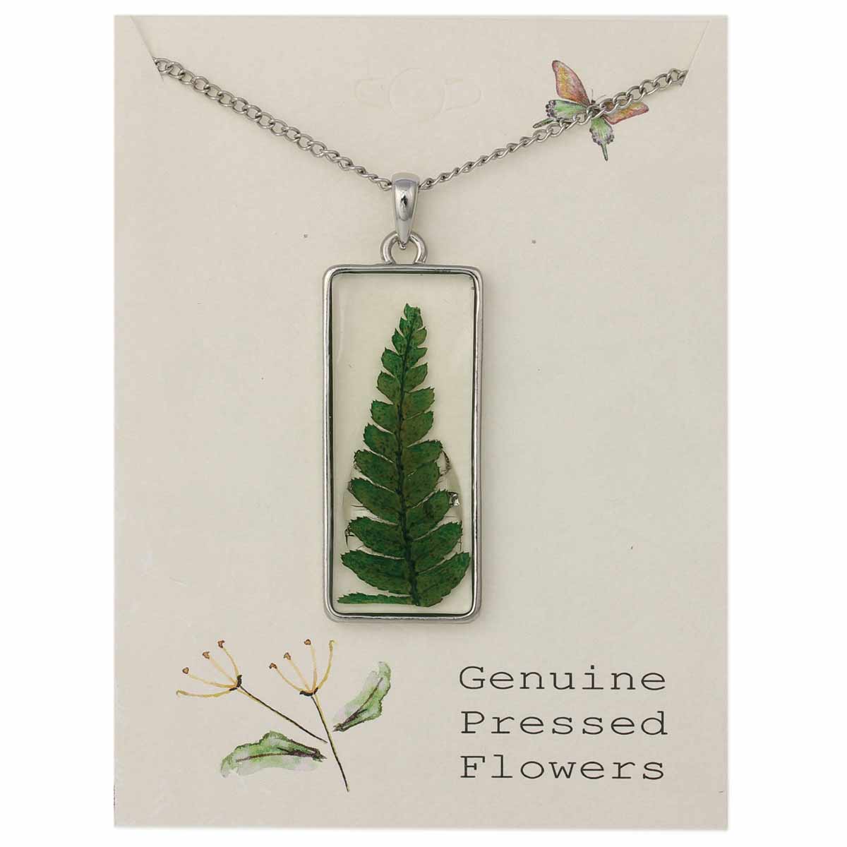 Bring home cottage style with genuine pressed flower jewelry! This delicate clear rectangle necklace features a fern frond dried flower embedded in clear resin with a silver border. Natural and sweet vintage design with genuine dried flowers. Measures about 2 inches long.