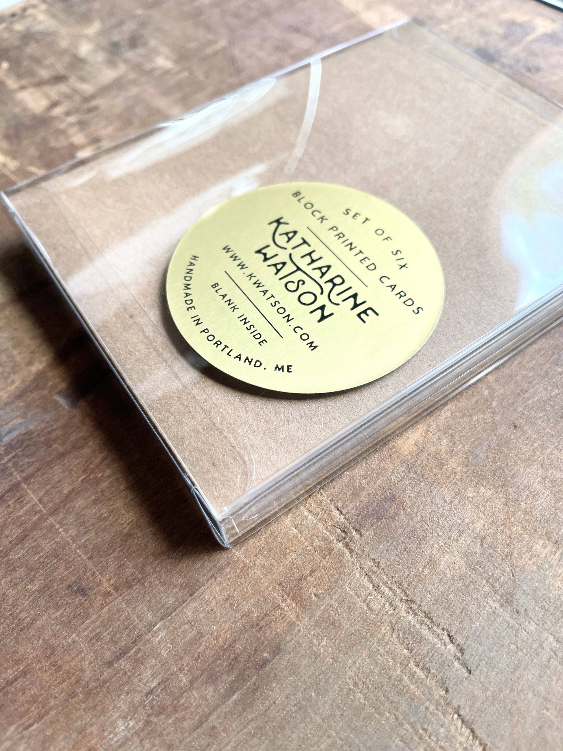 A Katharine Watson offset printed card, printed in Maine on 100lb cream cardstock. Each card is a standard A2 size, 5 ½” by 4 ¼”, is blank on the inside, and comes with a 100% recycled kraft envelope.
