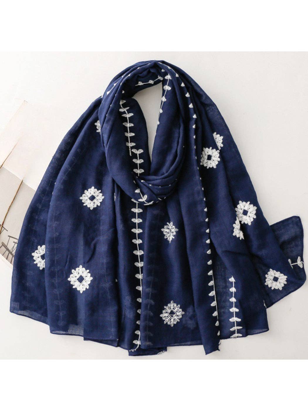 71 x 35 in. Soft brushed polyester with a decorative embroidered motif trim — a plush, lightweight modern motif scarf that layers easily as a scarf, wrap or shawl. Lightweight and packable. Care: follow garment label; gentle or cold machine wash, low tumble or lay flat to dry, avoid high heat ironing on the trim. Styling ideas: Layer over a coat as a statement wrap, or drape as a shawl for travel or evening.