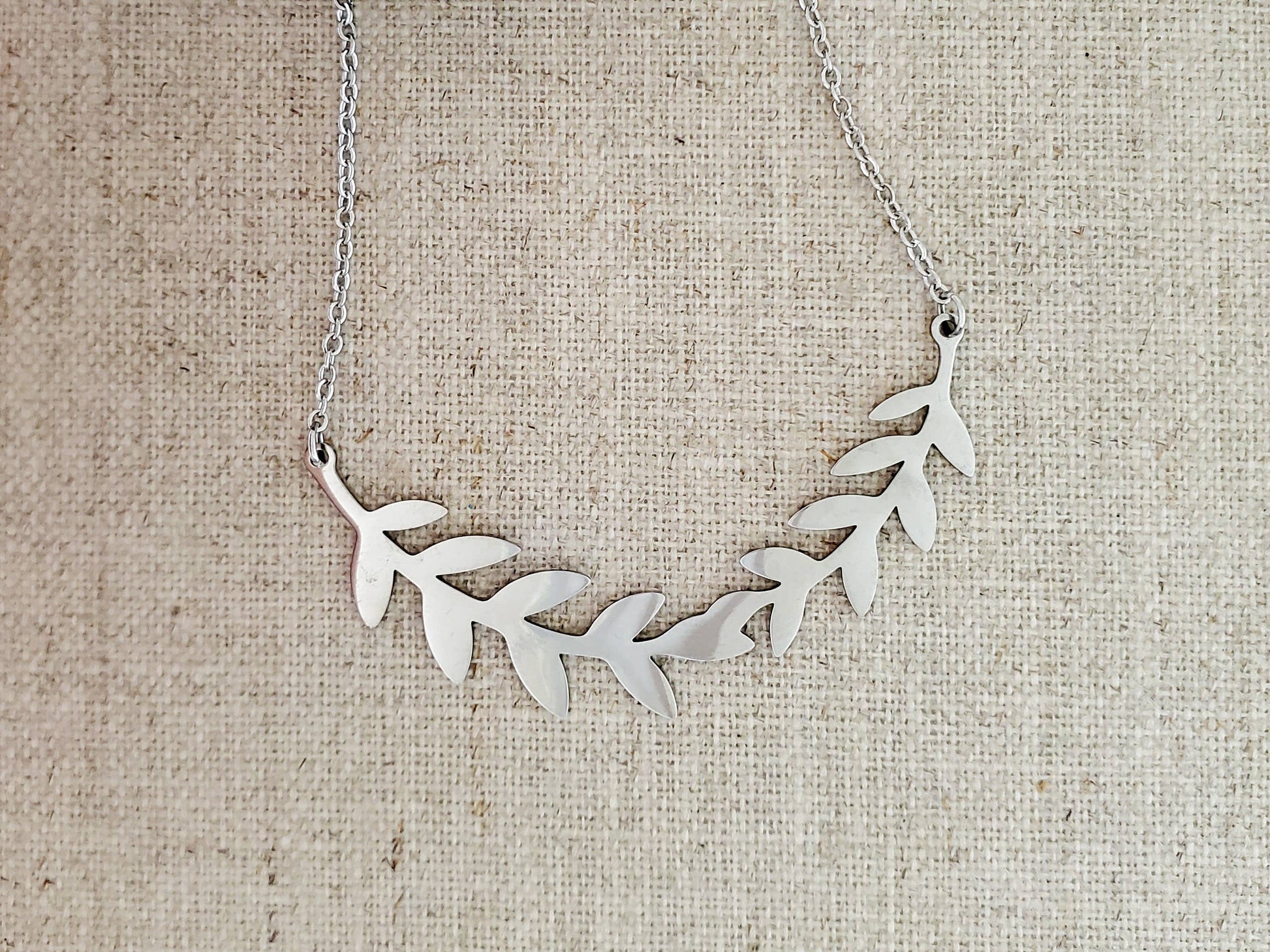 Steel branch necklace from Covaly Artisan Jewelry. The pendant and chain are durable, hypoallergenic stainless steel. The chain is 18" in length, and the pendant measures 1" x 2-1/4". Lightweight and stylish!