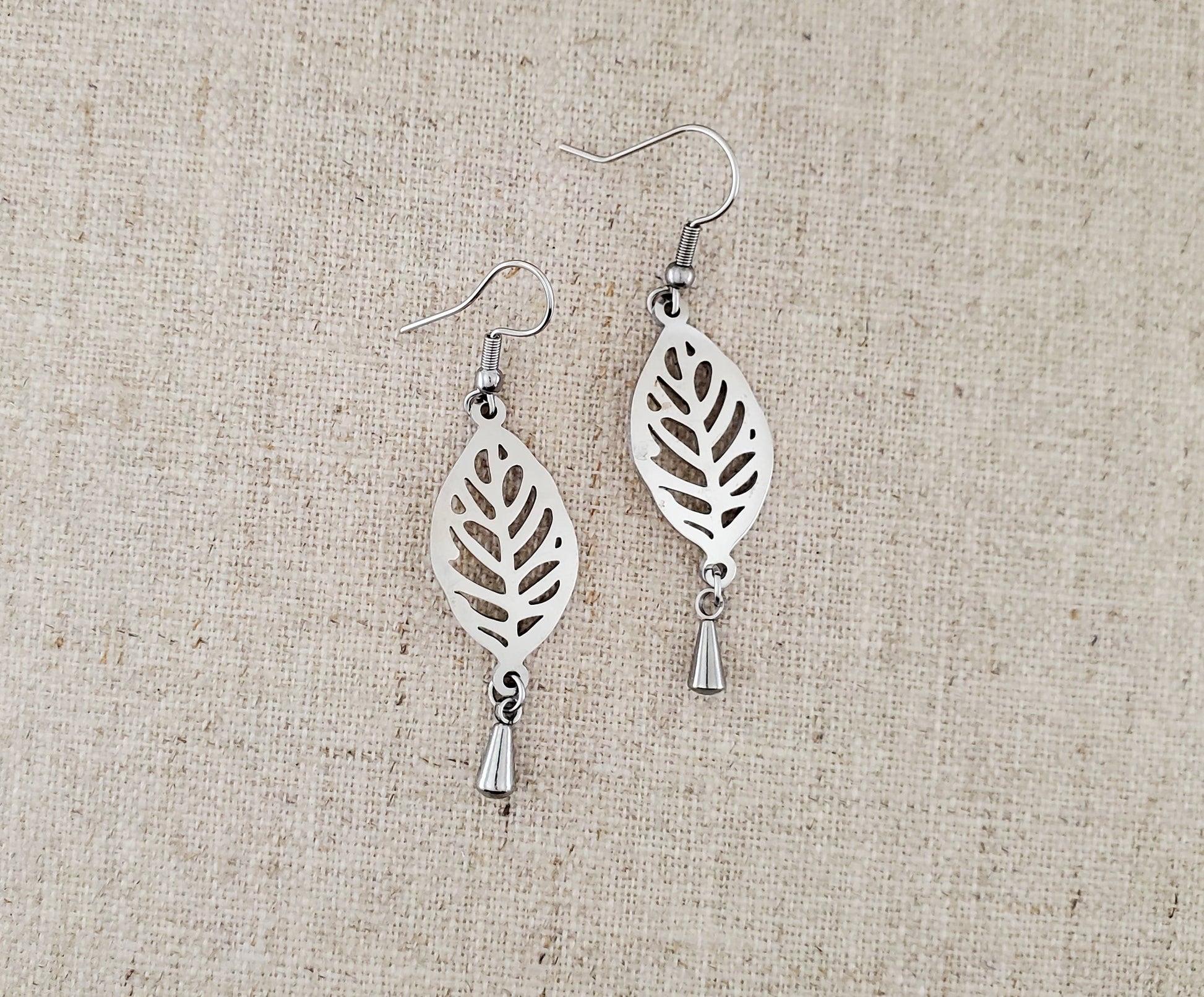 Bold design with a natural leaf motif. These leaf dangle earrings from Covaly Artisan Jewelry are perfect for those days you want to make a statement. The drops and ear wires are made from durable, hypoallergenic stainless steel. Measurements: 9/16" wide, 2-1/4" total length.