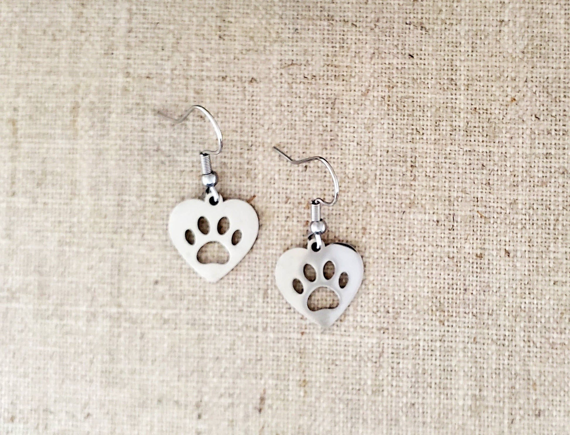 Sweet, heart-shaped drop earrings featuring a pawprint design. Perfect for the animal lover in your life. The drops and ear wires are made of durable, hypoallergenic stainless steel. Measurements: 5/8" wide, 1-1/4" in total length. Lightweight and versatile!