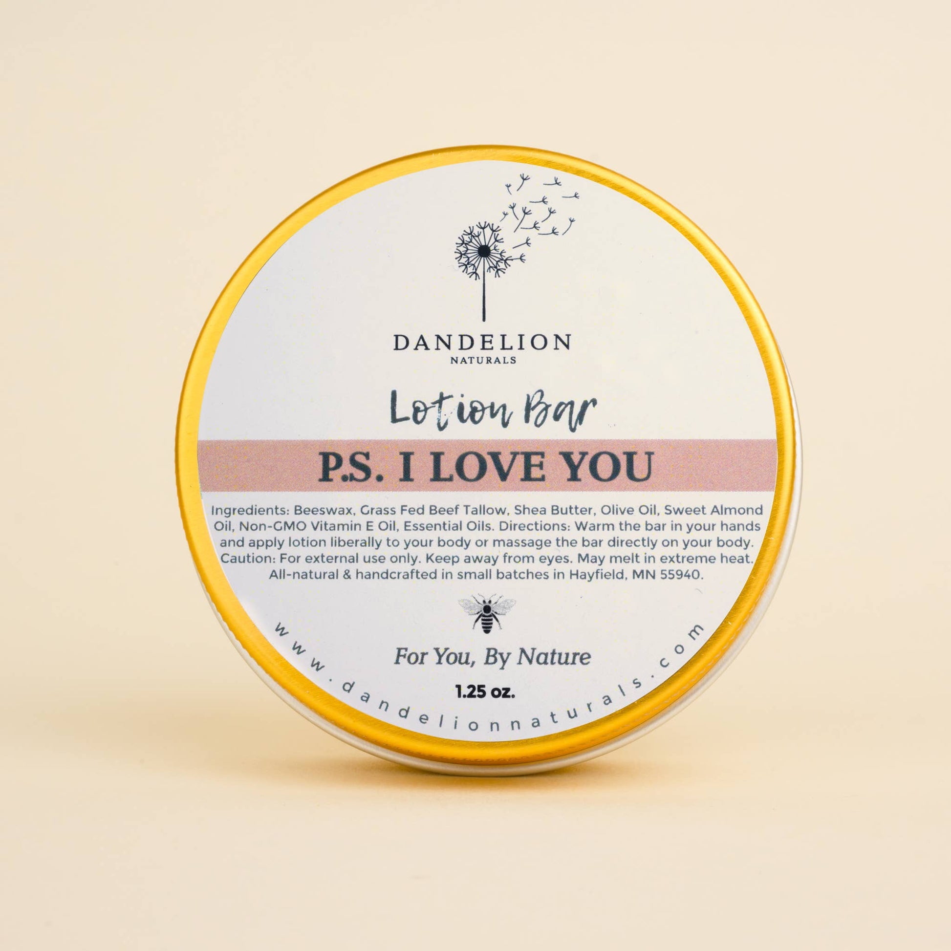 Tallow Lotion Bars from Dandelion Naturals are a great alternative to liquid lotions! They do not contain water or preservatives and are 100% natural! These are a customer favorite. Warm the bar in your hands and apply lotion liberally to your body or massage the bar directly onto your body. The warmth of your skin activates the lotion to help it glide on smoothly. These are great for dry skin areas such as hands, elbows, and feet and are safe to use externally anywhere on your body. Lotion bars are convenient for your purse, travel, or gym bag and come in a handy tin with a screw top lid. The ingredients are picked for their moisturizing, healing, anti-inflammatory, and antimicrobial properties leaving your body moisturized and healthy all day long. This Lotion Bar pairs beautifully with our top selling P.S. I Love You Bar Soap. Great duo for a cute gift set.