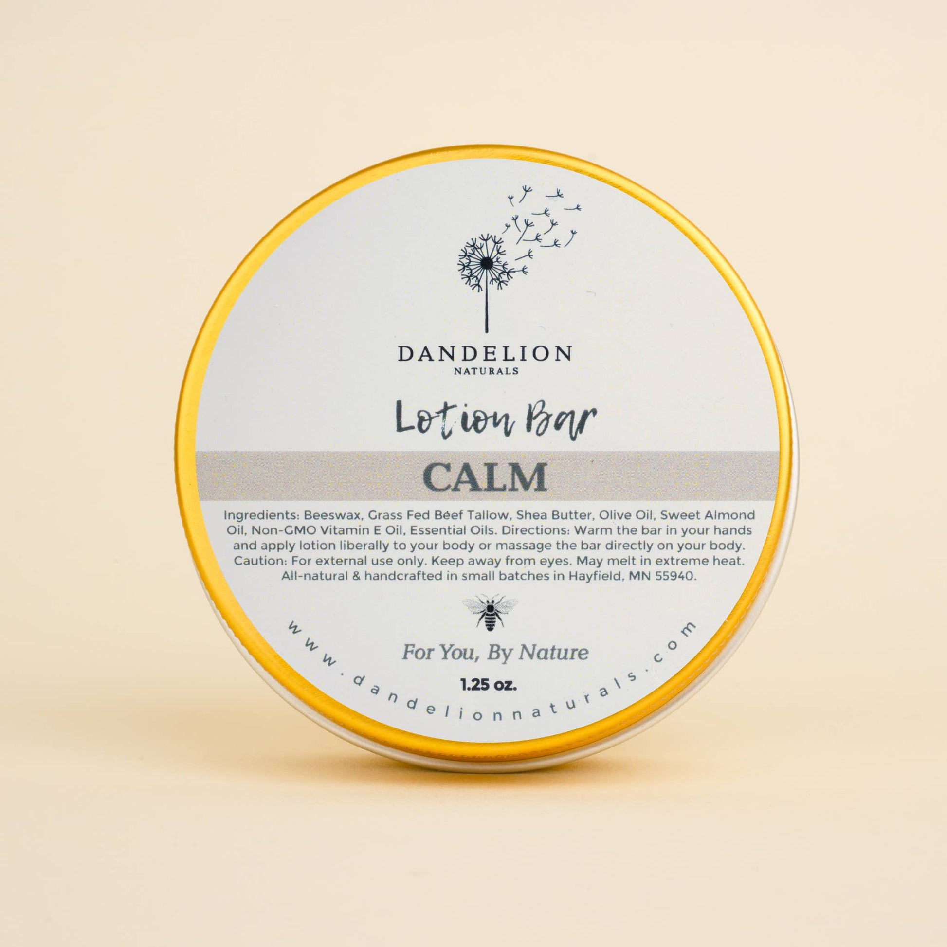 Tallow Lotion Bars are a great alternative to liquid lotions! They do not contain water or preservatives and are 100% natural! These are a customer favorite. Warm the bar in your hands and apply lotion liberally to your body or massage the bar directly to your body. The warmth of your skin activates the lotion to help it glide on smoothly. These are great for dry skin areas such as hands, elbows, and feet and are safe to use externally anywhere on your body. Lotion bars are convenient for your purse, travel, or gym bag and come in a handy tin with a screw top lid. Dandelion Naturals' ingredients are picked for their moisturizing, healing, anti-inflammatory, and antimicrobial properties leaving your body moisturized and healthy all day long. This Lotion Bar pairs beautifully with our top selling Calm Bar Soap. Great duo for a cute gift set.